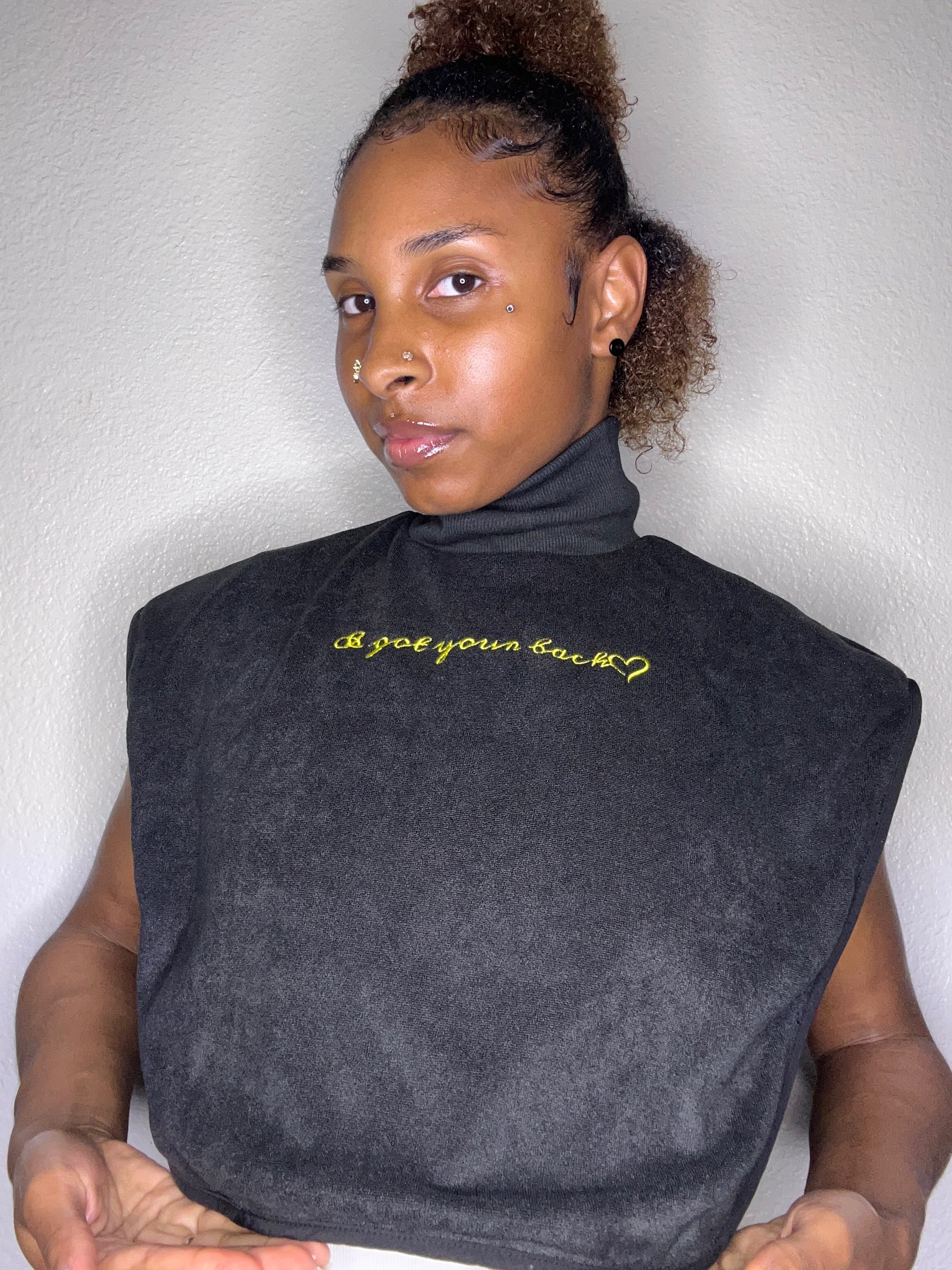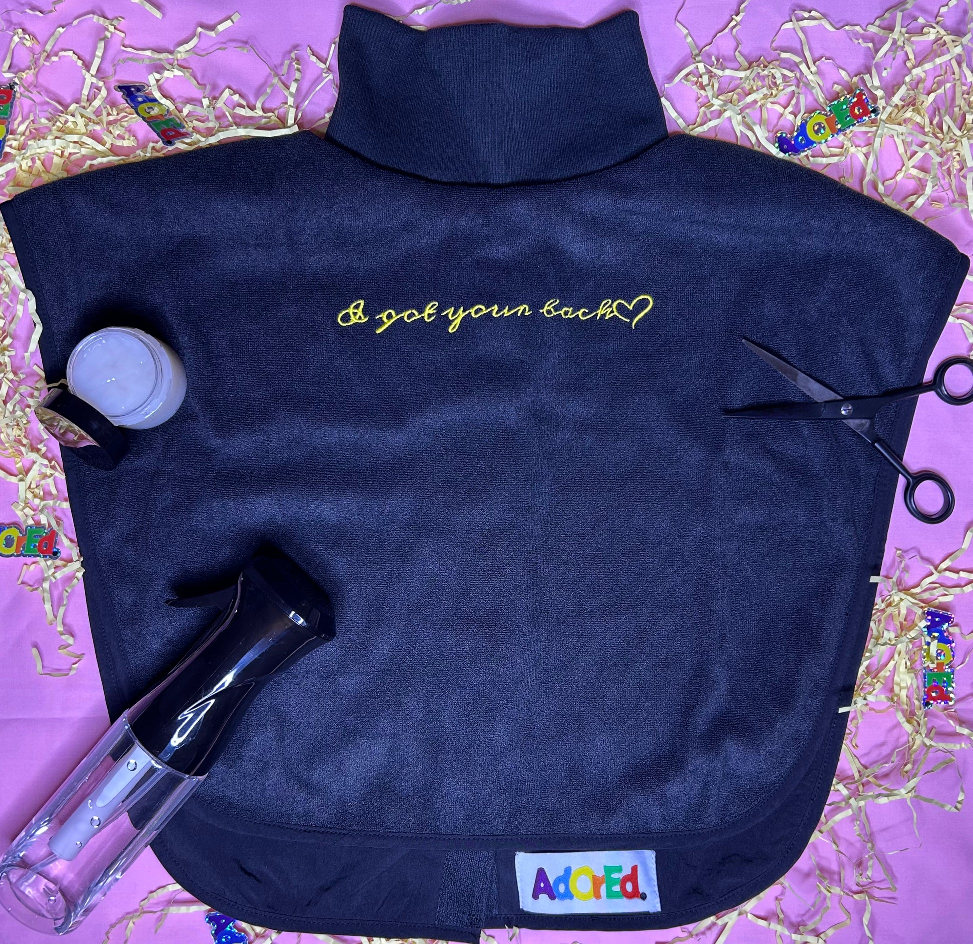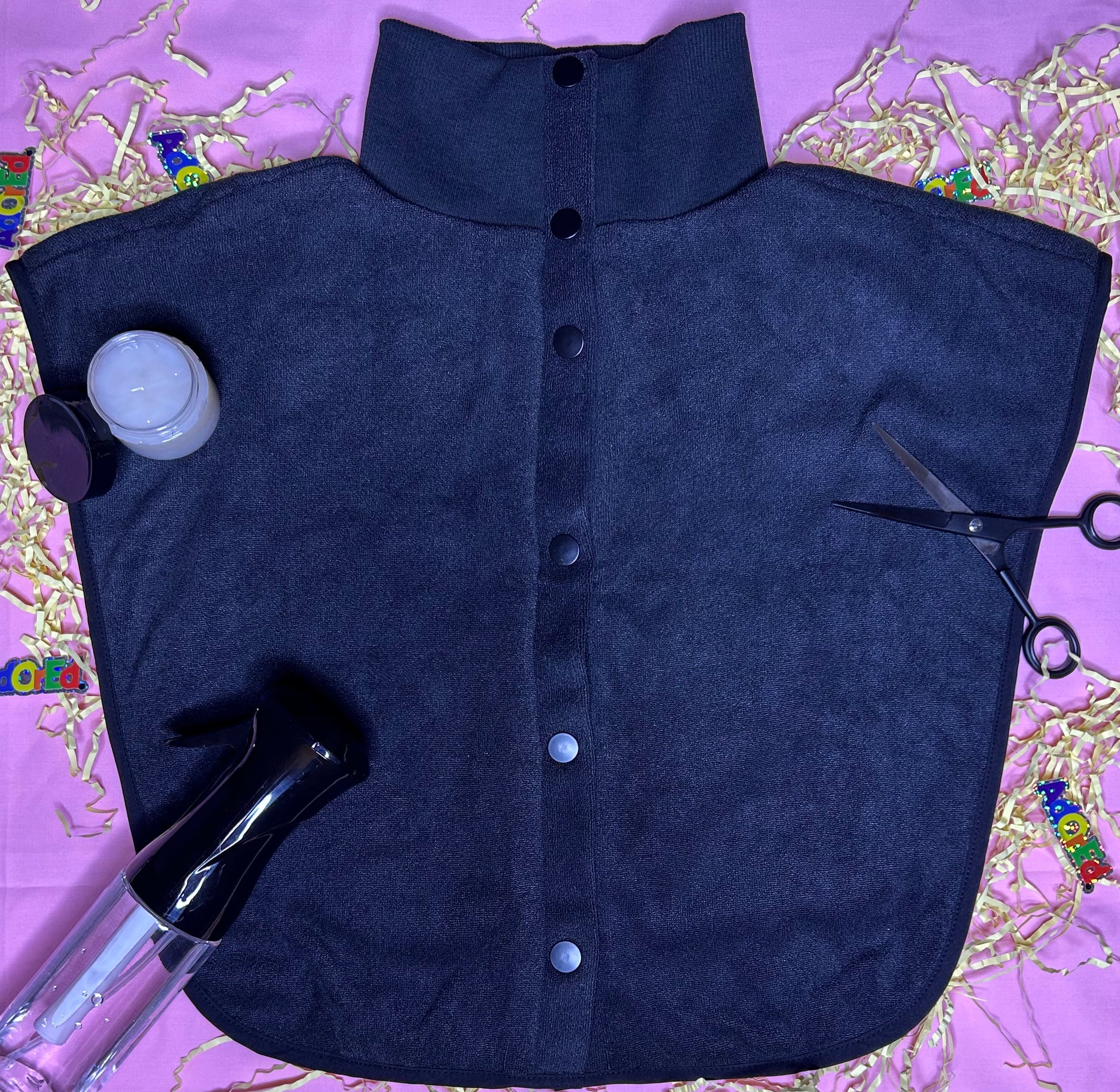 A water resistant bib designed to be worn on top of clothing, to provide protection from oily, wet hair products, makeup, and more. Machine wash & airdry.